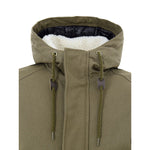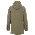 Long Green Fabric Parka Jacket with Large Pockets. Front zip and covered button closure, two large side pockets with snap closures, side pockets, and an adjustable hood. The inside of the upper body and hood are lined with Sherpa fur. Composition: 74% Nylon, 26% Cotton