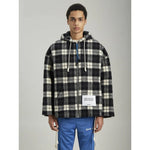 LONG SLEEVES HOODED JACKET WITH CHECKED PATTERN IN BEIGE AND BLACK ALL OVER. “ARCHIVE PROPERTY OF PALM ANGELS” PATCH IN WHITE SEWN AT FRONT. ZIP CLOSURE AND WELT POCKETS AT FRONT. WHITE DRAWSTRINGS.