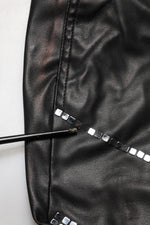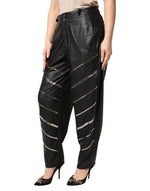 black tapered pants, featuring refined embellishments that add a touch of modern glamour. Crafted from premium materials, they offer a sleek, tailored silhouette that flatters the figure while maintaining comfort. The tapered leg creates a sophisticated, streamlined effect—perfect for evening events, chic daytime outfits, or fashion-forward ensembles. A striking blend of elegance and contemporary design.