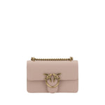 Calfskin Love One Mini Shoulder Bag by Pinko, featuring front flap closure with magnetic button, iconic silver-plated Love Birds logo embossed on front, dual interior compartment, sliding chain strap, iconic tone-on-tone embroidered brand monogram on back, adjustable and removable flat leather shoulder strap.