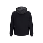 The hooded Jacket by Prada features a front zip fastening and a functional, contemporary design. It is designed with three pockets: two side zip pockets and a single pocket crafted in contrasting material, enhanced by an applied metal logo plaque that adds a distinctive and recognizable touch. The hood completes the piece, combining practicality with refined aesthetics.