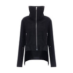 Rick Owens virgin wool Exploder Jacket, featuring a high collar and front zip fastening. It features two side zipped welt pockets, adjustable zipped cuffs and a symmetrical hem with a longer back panel, for a dynamic and contemporary effect. A functional garment with a distinctive style.