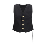 The twill Vest by Sacai is an elegant and versatile garment, featuring a V-neckline that accentuates its sophisticated silhouette. The gold button closure adds a touch of class, while the two welt pockets on the front offer practicality and style. The side drawstring allows you to adjust the fit, making this vest ideal for creating refined or casual-chic looks, perfect for any occasion.