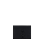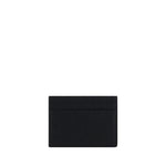 Calfskin Card Holder by Saint Laurent, card slots on front and back, plaque with iconic brand logo embossed on front.