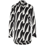 Discover the Street One Satin 344446 women’s long-sleeved blouse, an elegant and trendy piece perfect for any occasion. Made from 100% viscose, this blouse feels lightweight and soft against the skin. The satin finish enhances the modern design, featuring a bold wave graphic print that adds dynamism and personality to your outfit. The straight cut and classic collar ensure a comfortable and versatile fit, suitable for both casual and more sophisticated looks. Buttoned cuffs and a front button closure complete the style, making it both practical and stylish. Ideal for spring and autumn, this blouse is a must-have for every woman’s wardrobe.