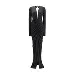 The Zelda Maxi Dress by The Andamane is a celebration of contemporary elegance and sensuality. Crafted from shiny jersey, it features a fluid silhouette with a plunging V-neckline at the front and an open back. Long sleeves frame the body, while draping at the bodice and ruching along the skirt create movement and femininity. A front slit cascades effortlessly to the floor, enhancing the dress’s bold yet refined allure.
