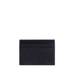 Leather Card Holder by Thom Browne, card slots on front and back, iconic striped tag on front, printed logo on bottom.