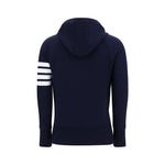 Thom Browne’s Cotton Hoodie features a front zipper closure and an adjustable drawstring hood for a customizable fit. Featuring two welt pockets on the front, it is enhanced by the iconic white bands on the left sleeve and the brand’s logo patch on the front. The ribbed hem and cuffs complete the design, making this sweatshirt a versatile and distinctive garment, perfect for a casual and refined look.