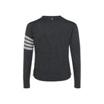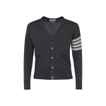 Fleece wool Cardigan by Thom Browne, striped cuffs with button, ribbed hem with adjustable side slits with buttons, V-neck, front button closure, two patch pockets on front, iconic brand logo bands on left arm, internal profiles with iconic brand colors.