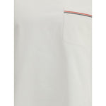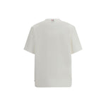 Thom Browne’s cotton T-Shirt is an essential garment reimagined with the brand’s unmistakable aesthetic. The design features a ribbed crew neck and an asymmetrical hem, enhanced by practical side buttons that add a functional and original touch. On the front, the classic logo patch and a patch pocket stand out, finished with stitching in the iconic colors of the maison.