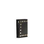 The Rockstud Wallet by Valentino Garavani is crafted from grained calfskin and embellished with the iconic platinum-finish studs. Compact yet functional, it features a snap-button closure, six card slots, a zipped coin pocket, and a bill compartment. A practical accessory with a bold touch.
