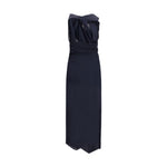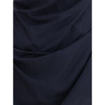 The Halter Galatea Dress by Vivienne Westwood shapes the figure with refined draping in semi-sheer wool, crafted with deliberately irregular seams for a unique asymmetric effect. The halter neckline cascades into folds that cinch at the waist, enhancing the silhouette and flowing into a column skirt. Sleeveless, with soft draping, a fitted waist, and an asymmetric hem, this dress is both elegant and contemporary.