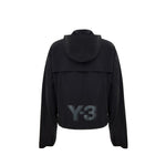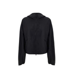 Front zip closure, two side pockets with visible zip closure, adjustable hood with drawstring. Elastic waist with two drawstrings. Contrasting faded logo printed on the back.